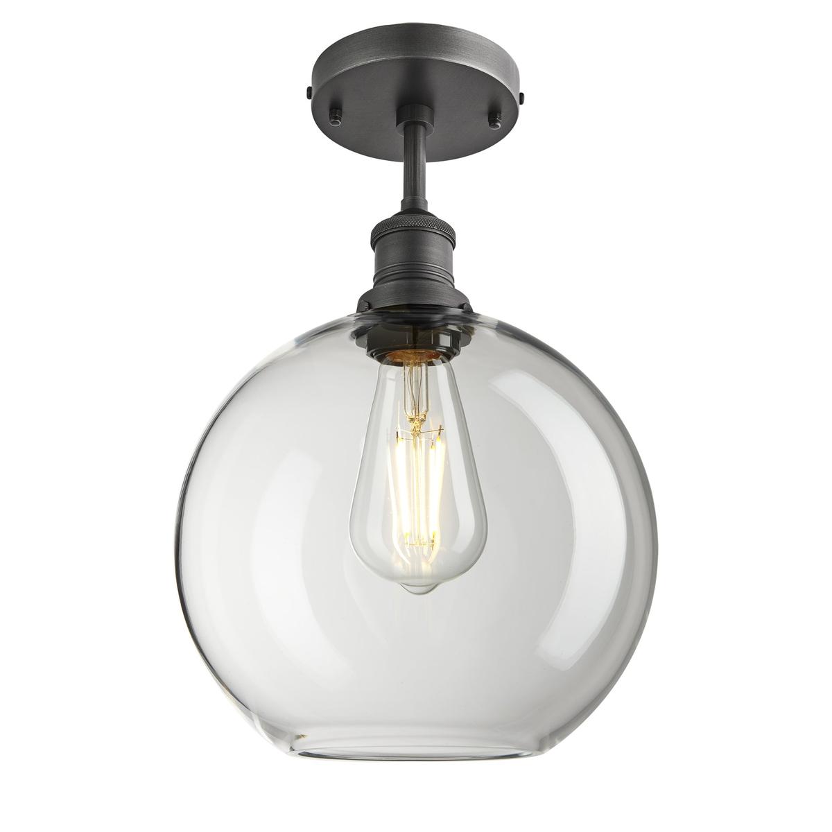 When industrial converges with classical. Invigorate your room and sample our Brooklyn Smoked Glass Globe Flush Mount in Clear glass. The clear glass exterior complements natural light effortlessly and expertly diffuses the artificial light to provide intimacy.