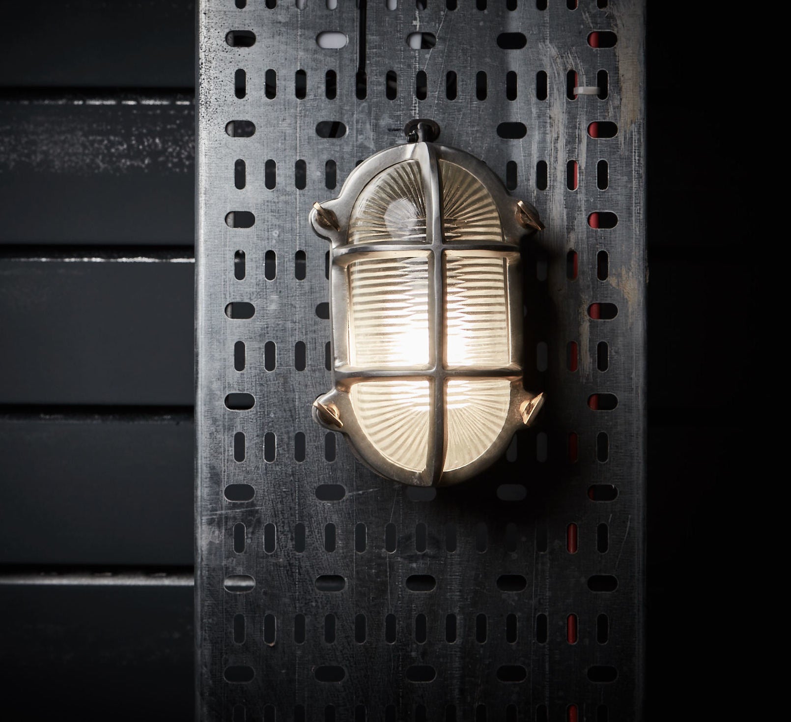 Black: Aluminium with a black finish and glass. Finished in a dark, gunmetal-inspired tone, this bulkhead reveals subtle metallic highlights through the black finish, giving it a layered, authentic look that feels aged and industrial rather than flatly painted. For a solid black painted finish, please contact us and we can produce a bespoke product to your specification.