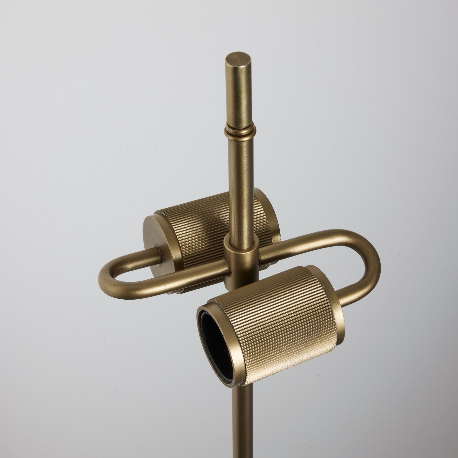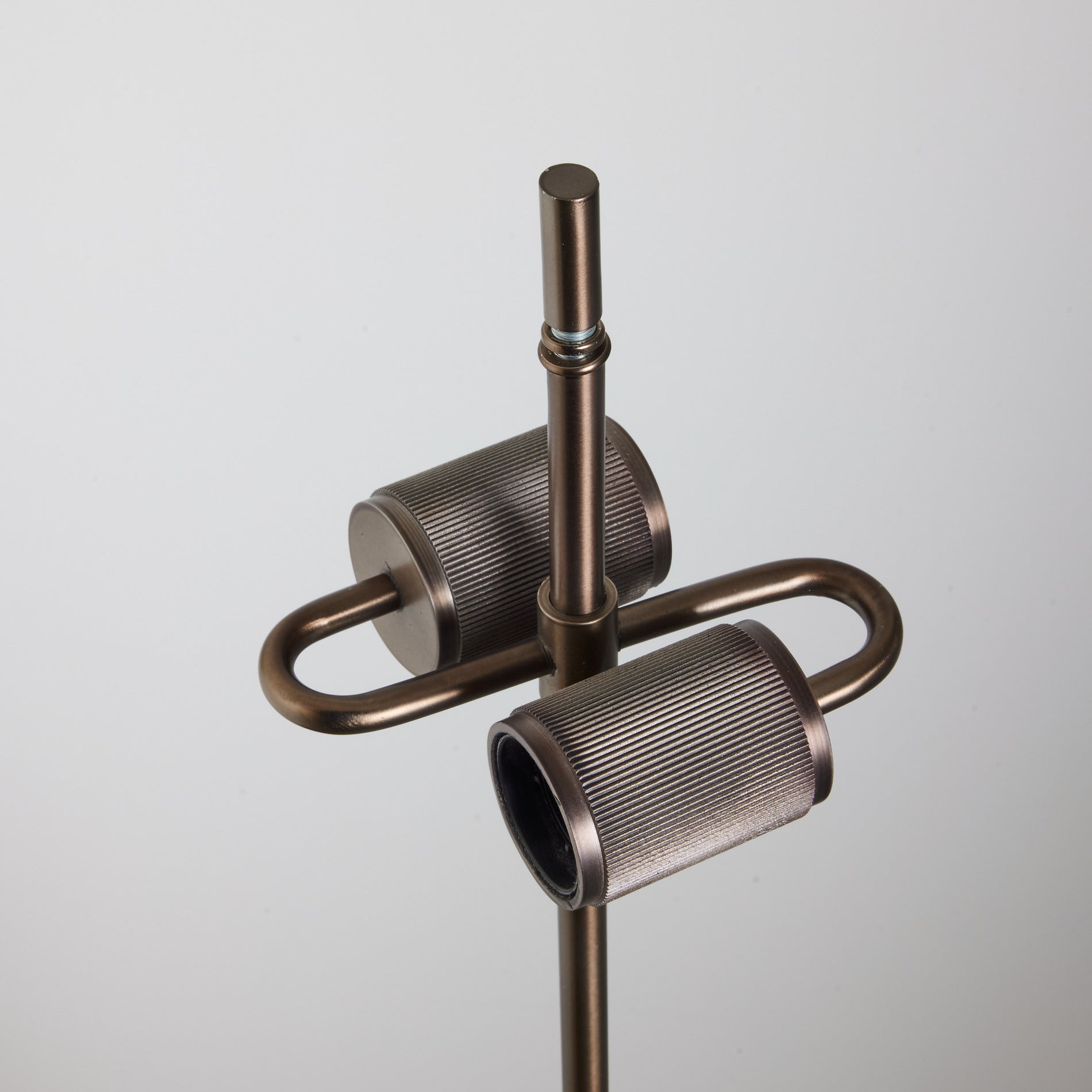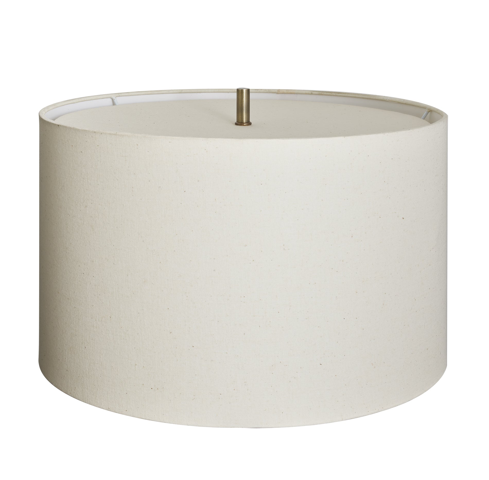 Paired with an elegant natural cotton drum shade, this floor lamp features an additional circular top diffuser, secured in place with a decorative metal spire. This diffuser helps create a more subdued and elegant light from the double bulb holder. The shade features an innovative fixing system making it specifically compatible with this unique lamp design.