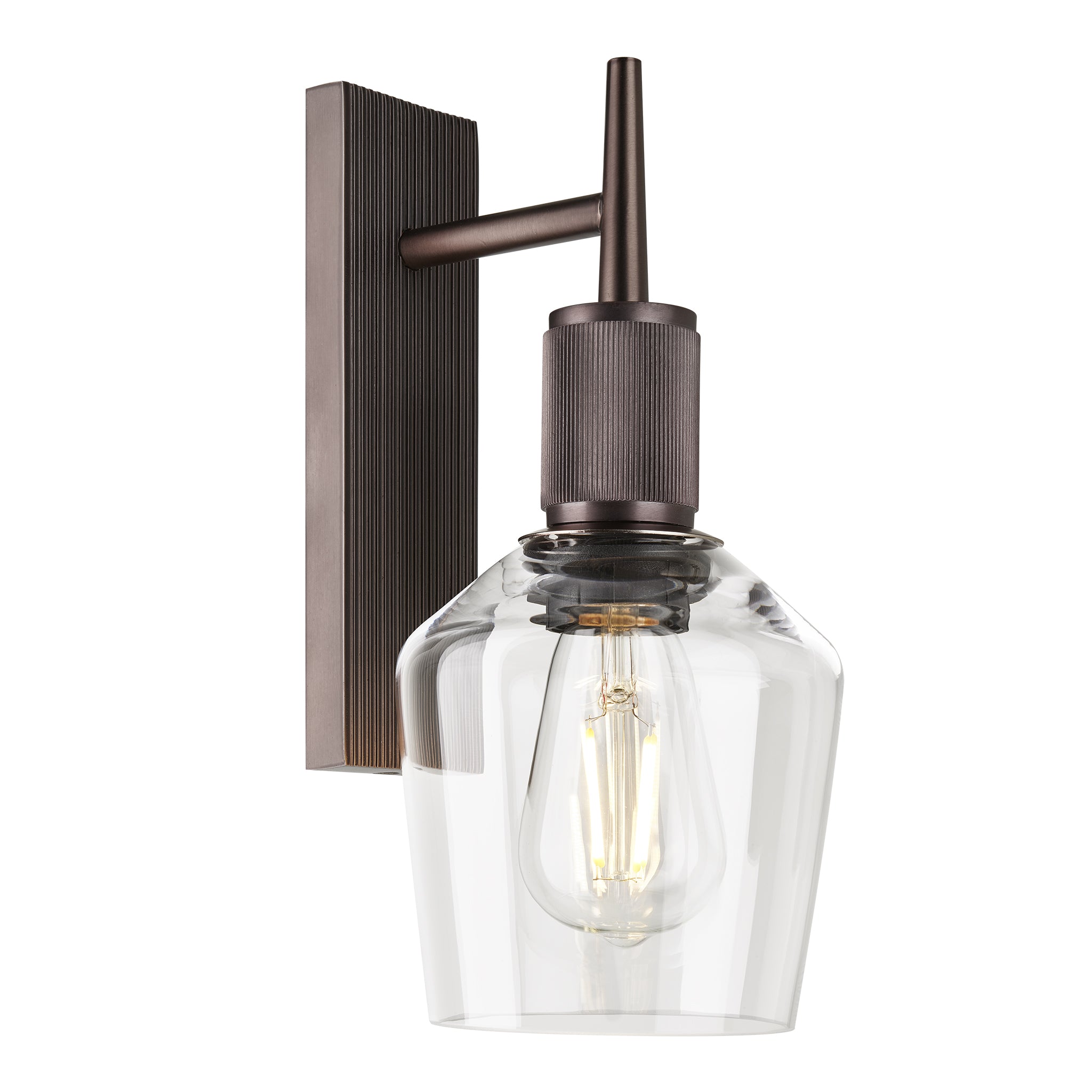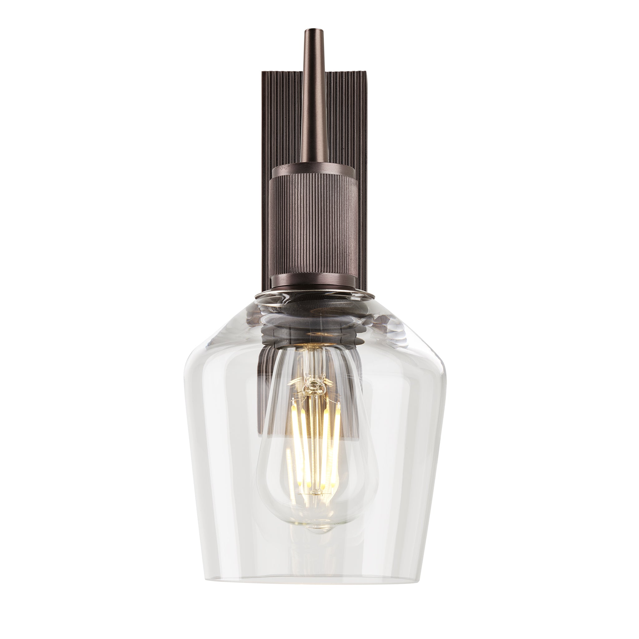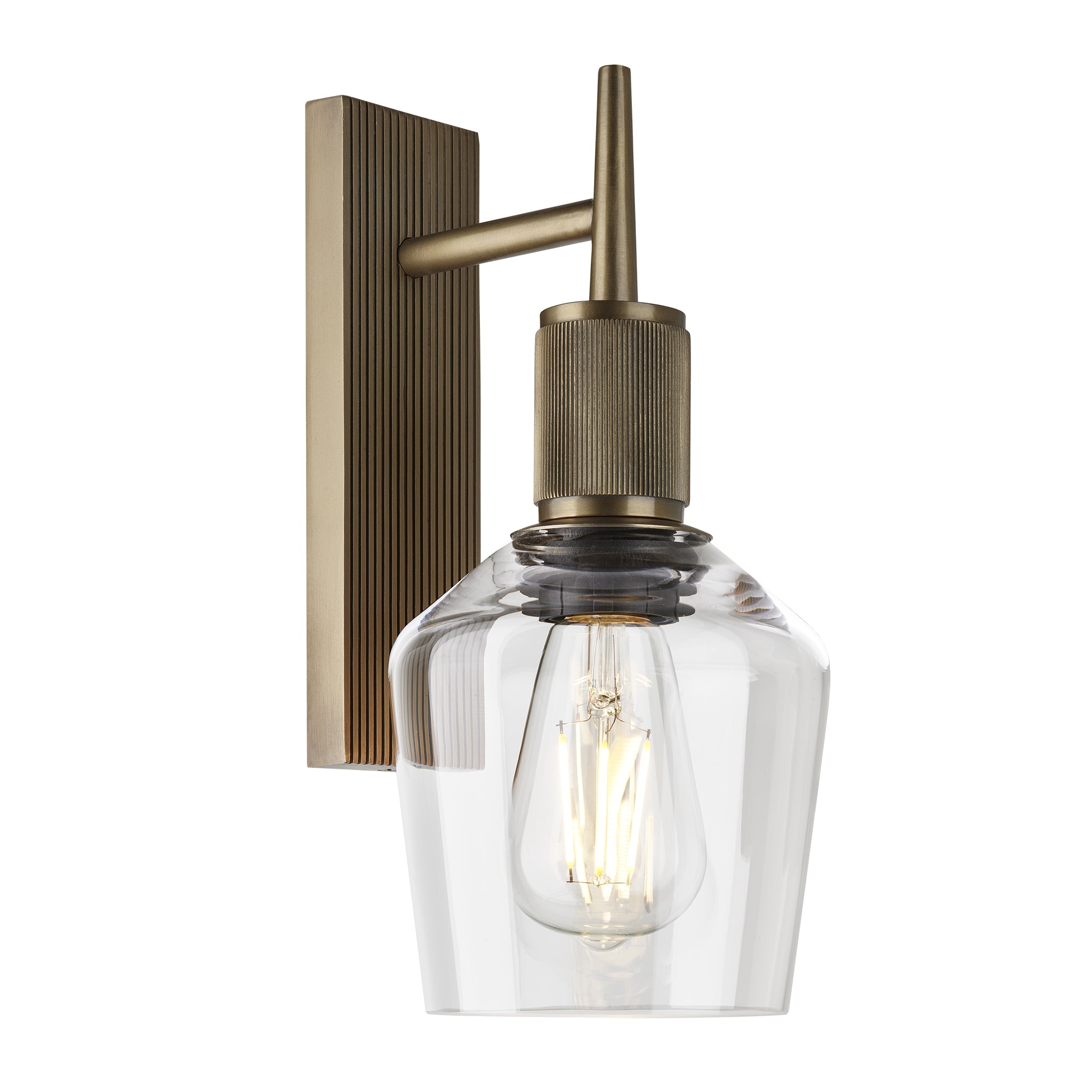 Henley Glass Schoolhouse Wall Light 5.5 Inch Clear featuring a single clear glass shade with a bronze holder side view Henley Glass Schoolhouse Wall Light 5.5 Inch Clear featuring a single clear glass shade with a bronze holder front view Henley Glass Schoolhouse Wall Light 5.5 Inch Clear featuring a single clear glass shade with a brass holder side view Henley Glass Schoolhouse Wall Light 5.5 Inch Clear featuring a single clear glass shade with a brass holder front view Wall light with a brass finish shown from an angled view, highlighting ribbed details without a lampshade Wall light with a brass finish shown from a front view, highlighting ribbed details without a lampshade Wall light with a bronze finish shown from an angled view, highlighting ribbed details without a lampshade Wall light with a bronze finish shown from a front view, highlighting ribbed details without a lampshade