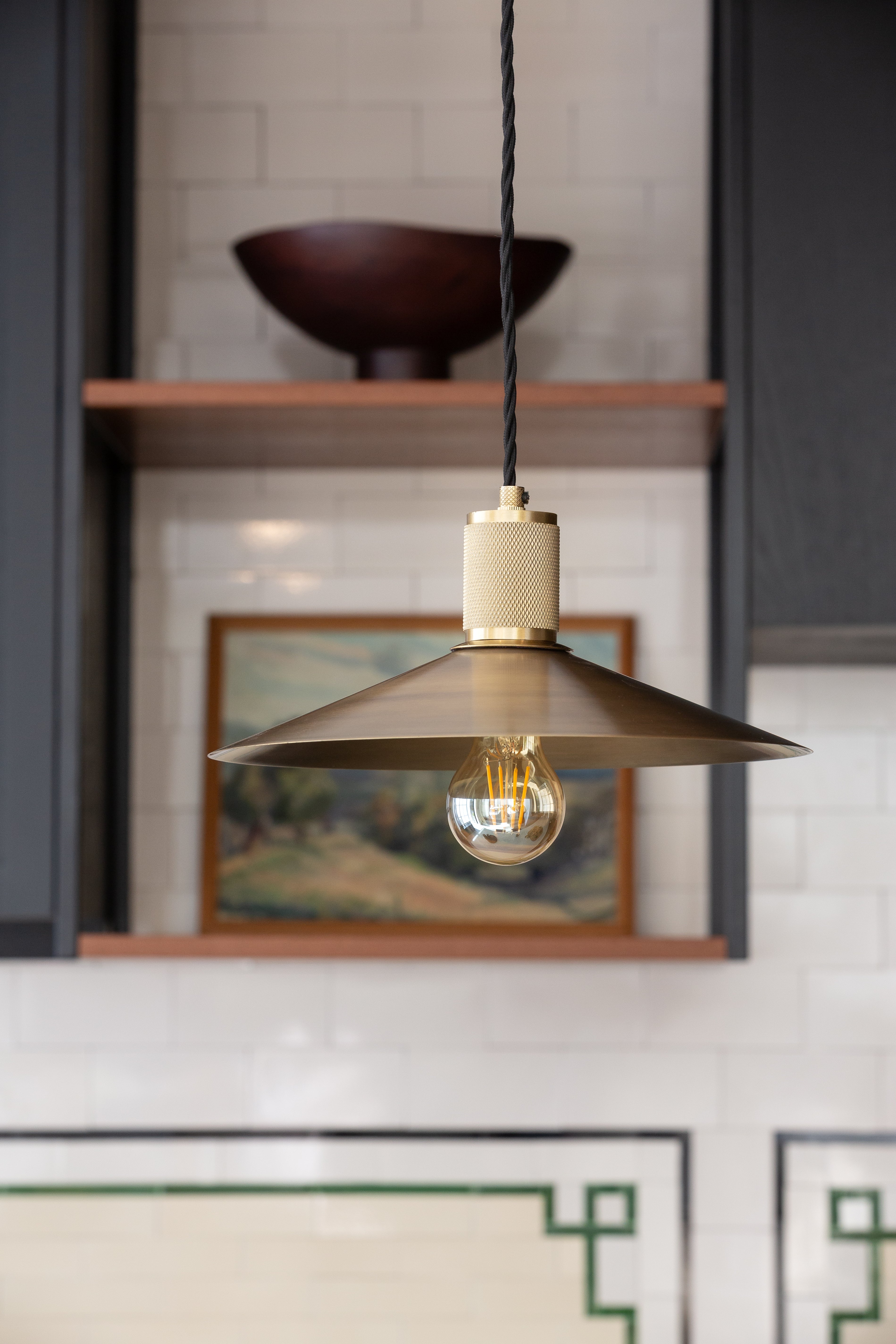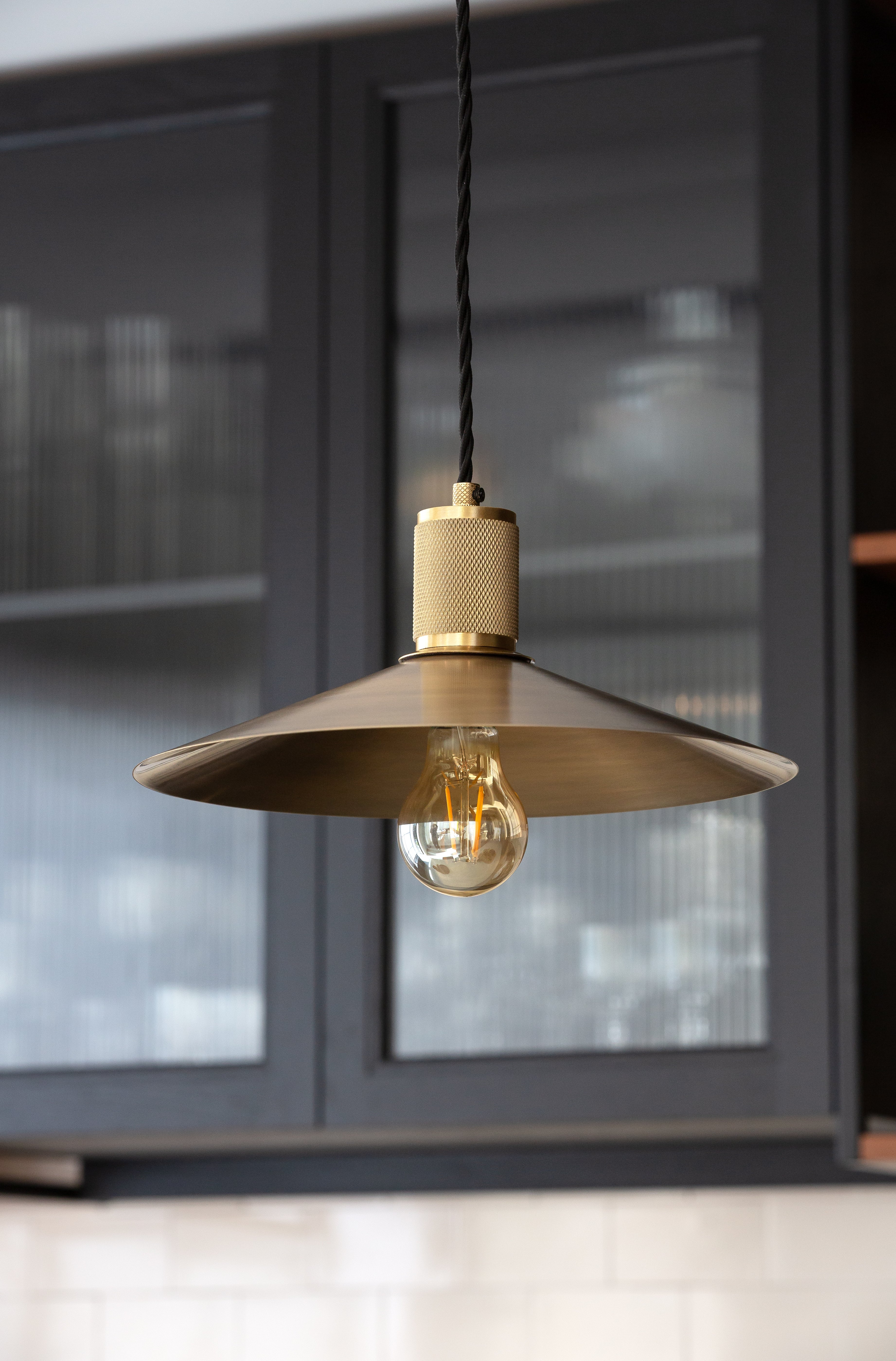 Designer note: A confident mix of industrial texture and clean geometry. The sharp, sloped shade creates a bold visual line, while the knurled holder adds tactile depth and precision. Finished in warm brass, it brings both character and clarity to kitchens, workspaces, or anywhere you want lighting that feels purposeful and refined.