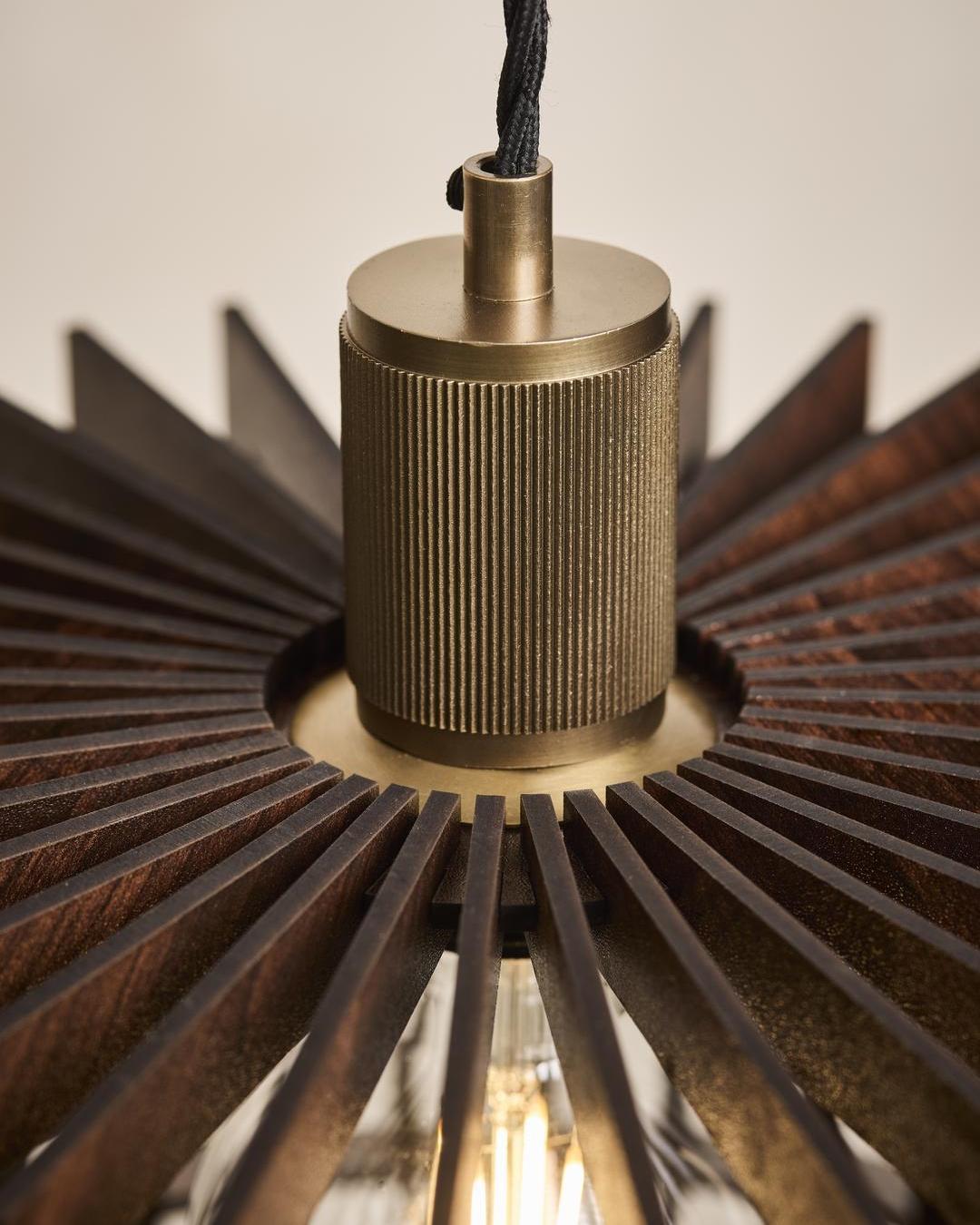 This pendant combines an elegant ribbed metal holder, with a striking and intricate wood finish drum shade. This piece is constructed from perfectly cut slats of wood veneer material for a long-lasting finish.