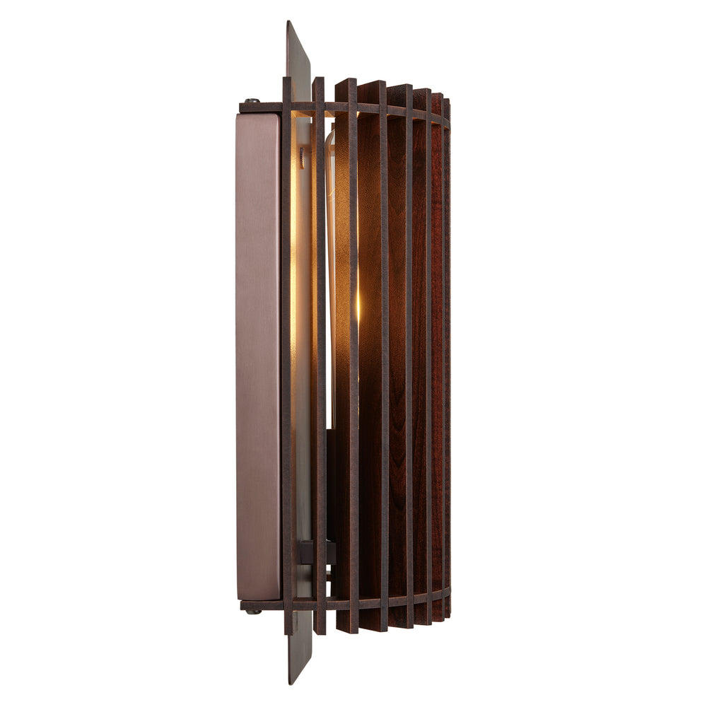 Natural Rift cylinder wall light with a dynamic slatted design with a dark wood veneer. Laser cut to ensure consistency. Supported by a flat, sleek metal holder to complement the striped shade.