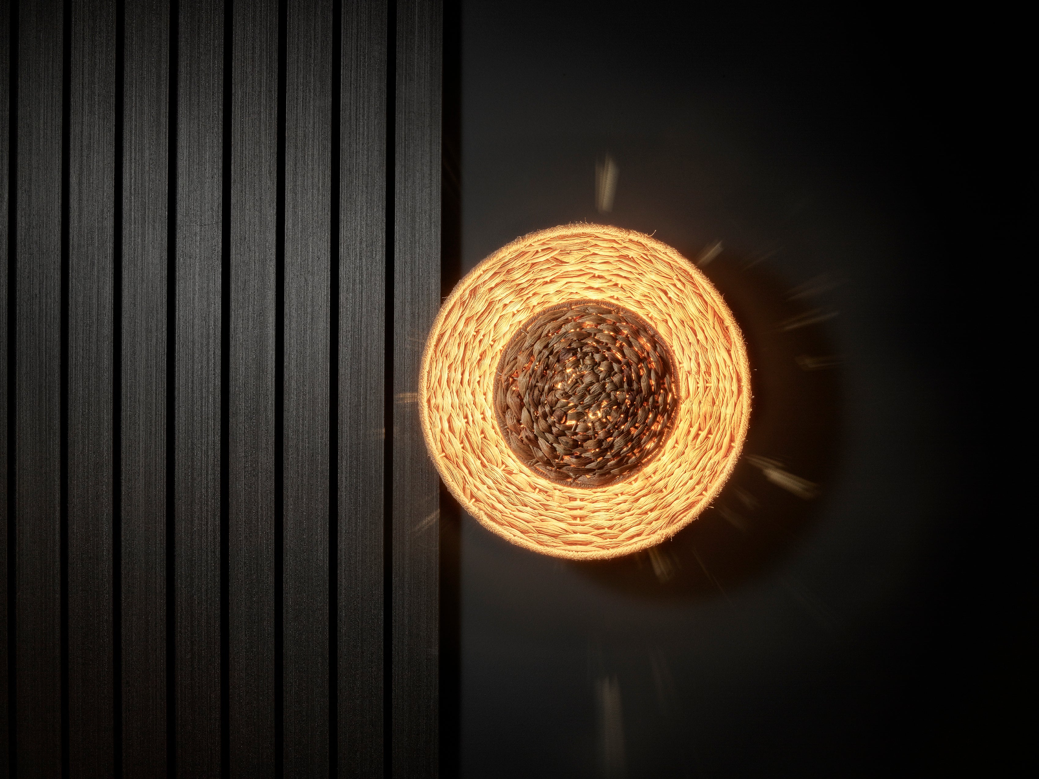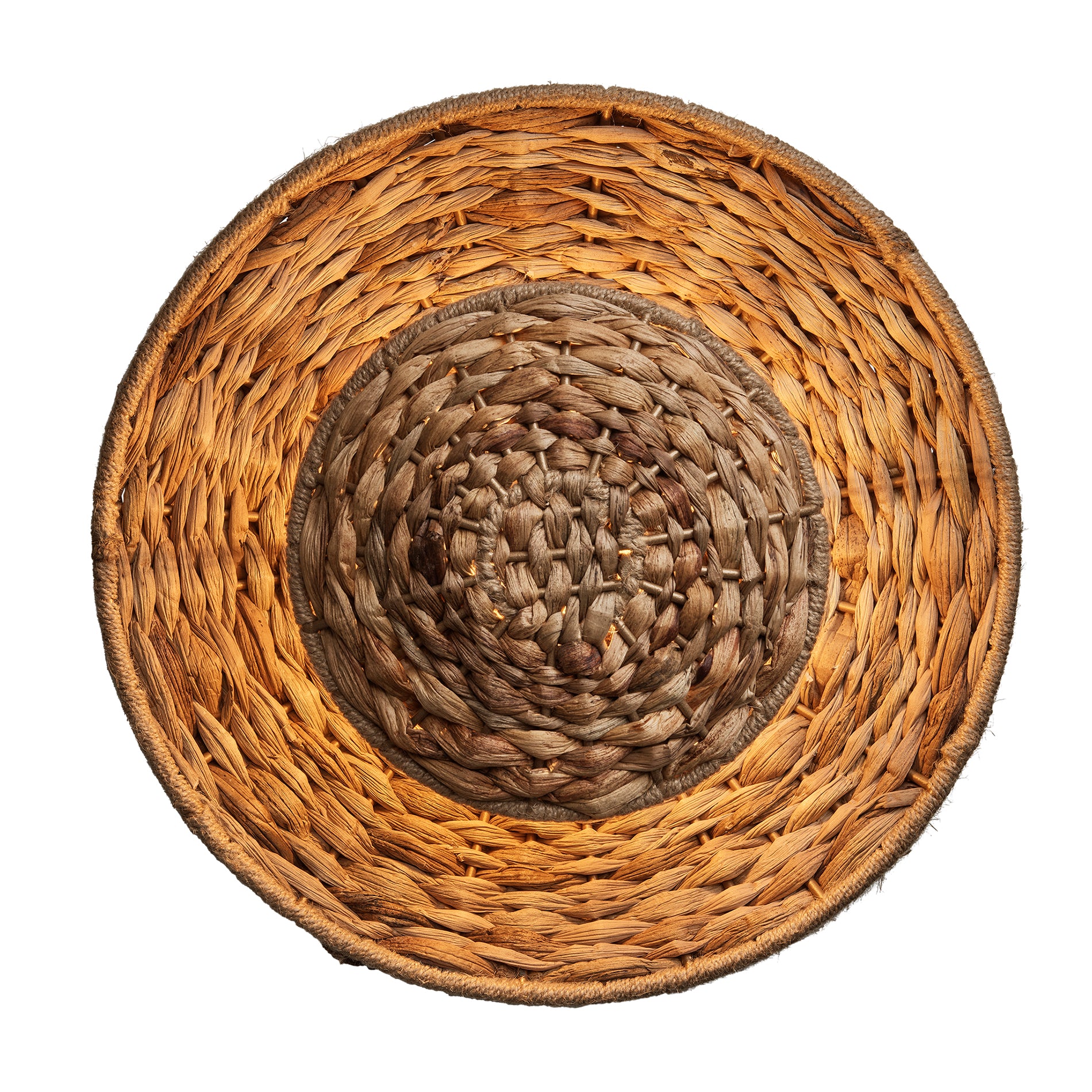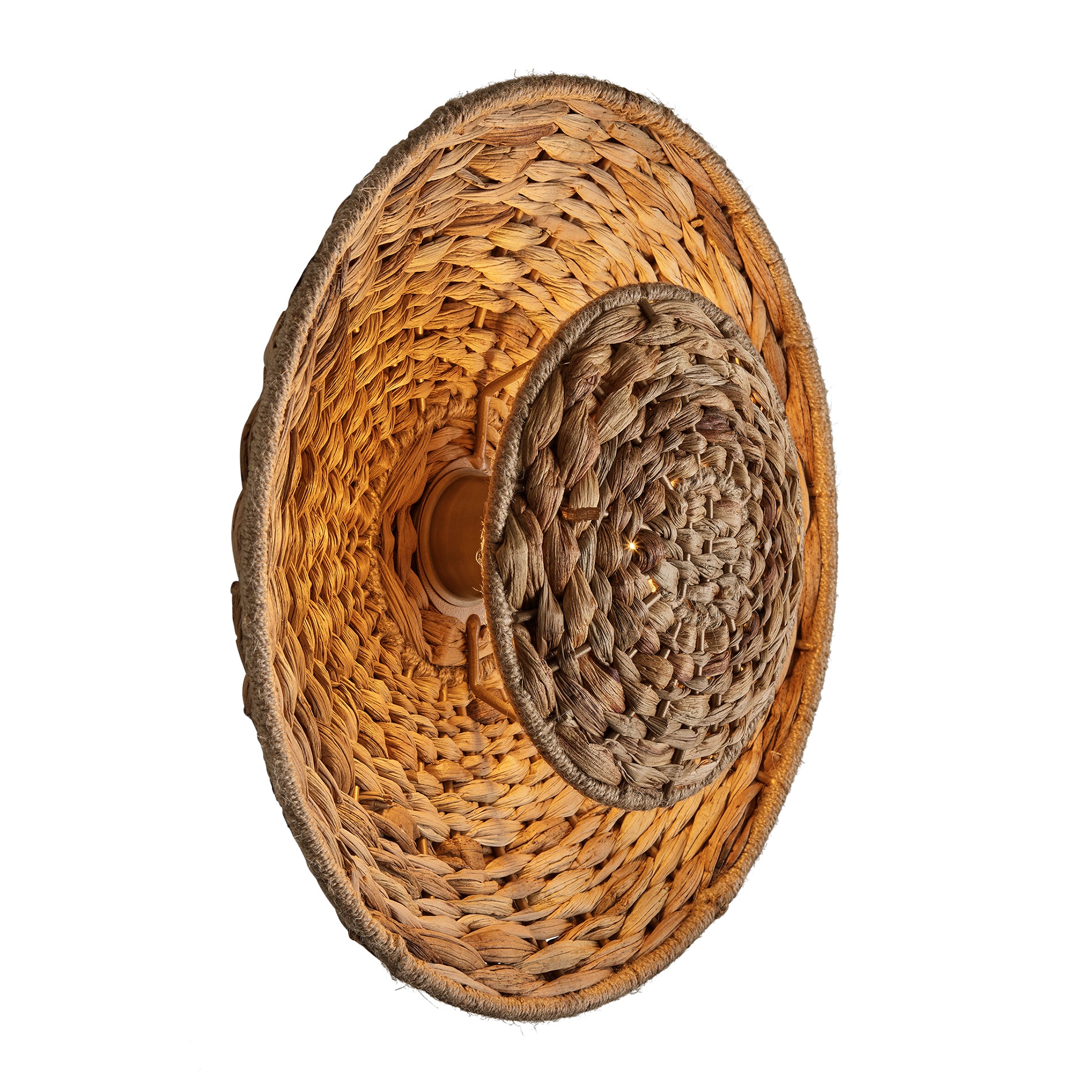 Organic Sea Grass light features a handwoven, bowl-shaped shade over an aged brass frame with natural jute detailing. Can be installed as a wall light or flush mount. This shade is complete with an inner disc shaped sea grass shade covering the bulb.