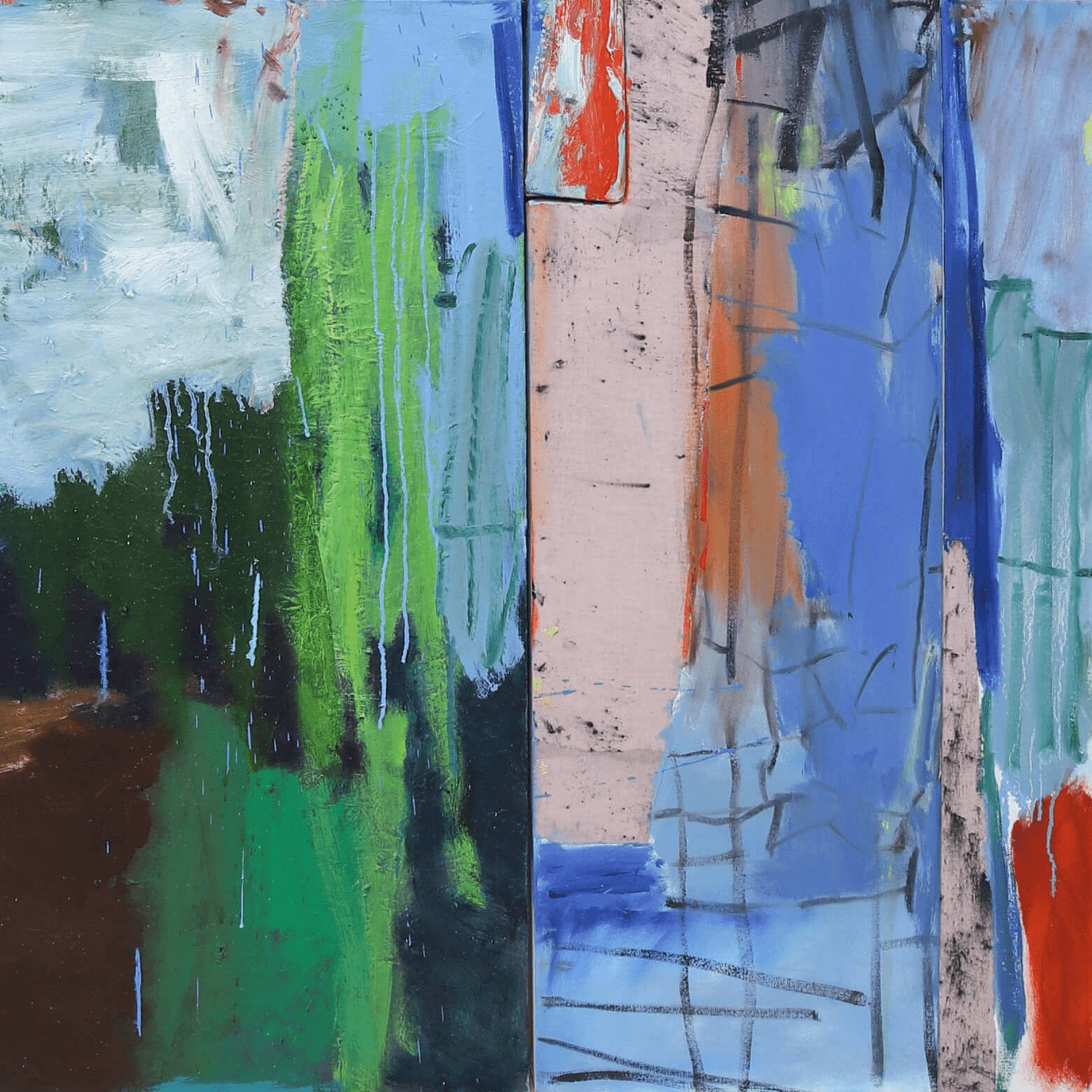 Canvas shapes extend and invade the space around them, and the surrounding space invades canvas. Multi-panelled paintings tell a continuous story through complementing each other. Because they have no precise rectangular borders, they seem to be in a constant motion and have the ability to transform.